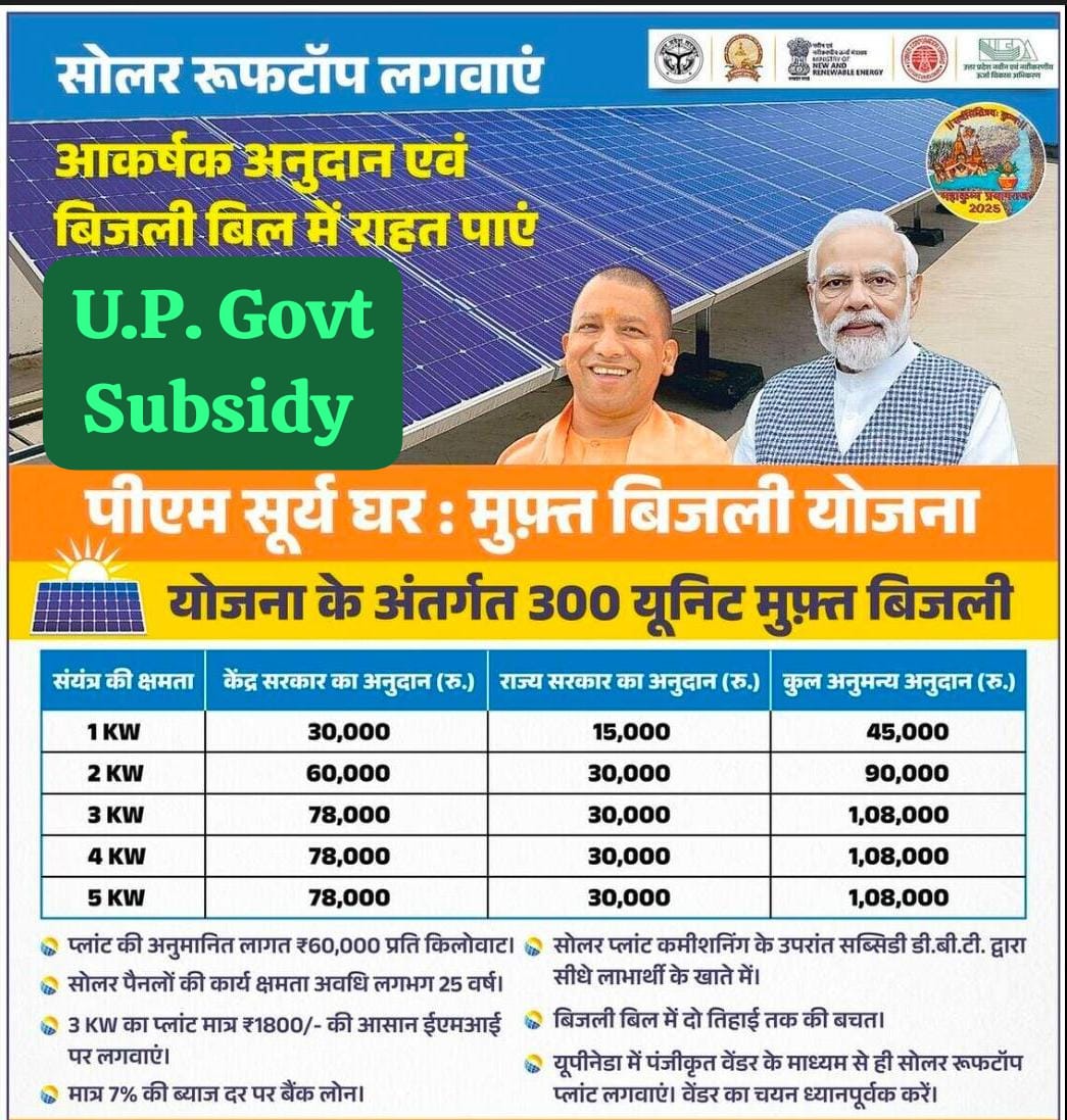 उत्तर प्रदेश लगभग ₹15,000–₹25,000 तक अतिरिक्त स्टेट सब्सिडी।[2][6] | ~₹78,000 + ~₹25,000 ≈ ~₹1,03,000 तक (योजना व लिमिट पर निर्भर)