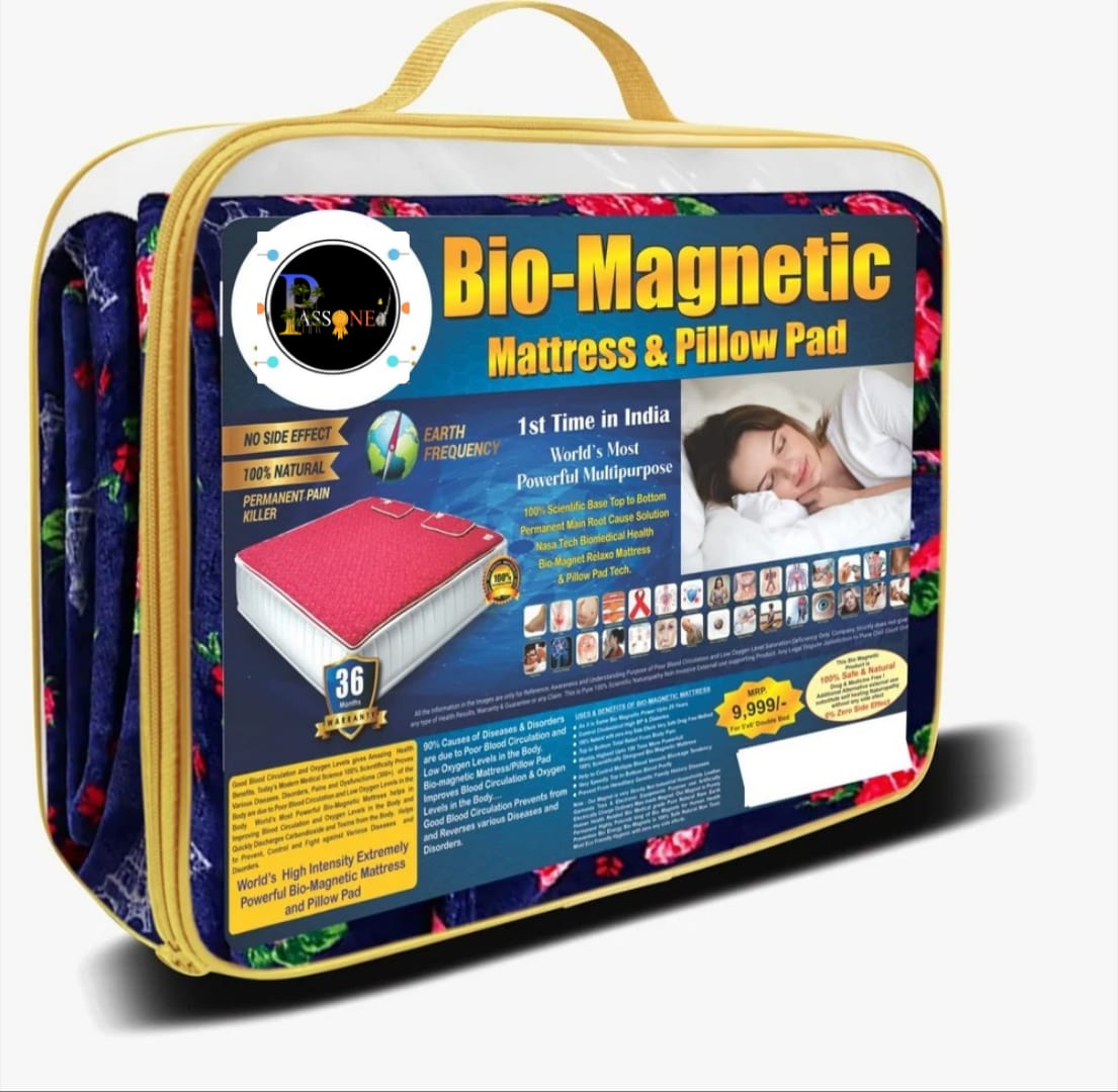Pass One Bio Magnetic Mattress double bed  bio-magnetic mattress is a therapeutic sleep surface embedded with strategically placed magnets designed to interact with the body’s natural magnetic fields. It aims to improve blood circulation, boost oxygen levels, and reduce pain, often combining foam/orthopedic materials with magnetic field therapy, far-infrared rays, or negative ions.